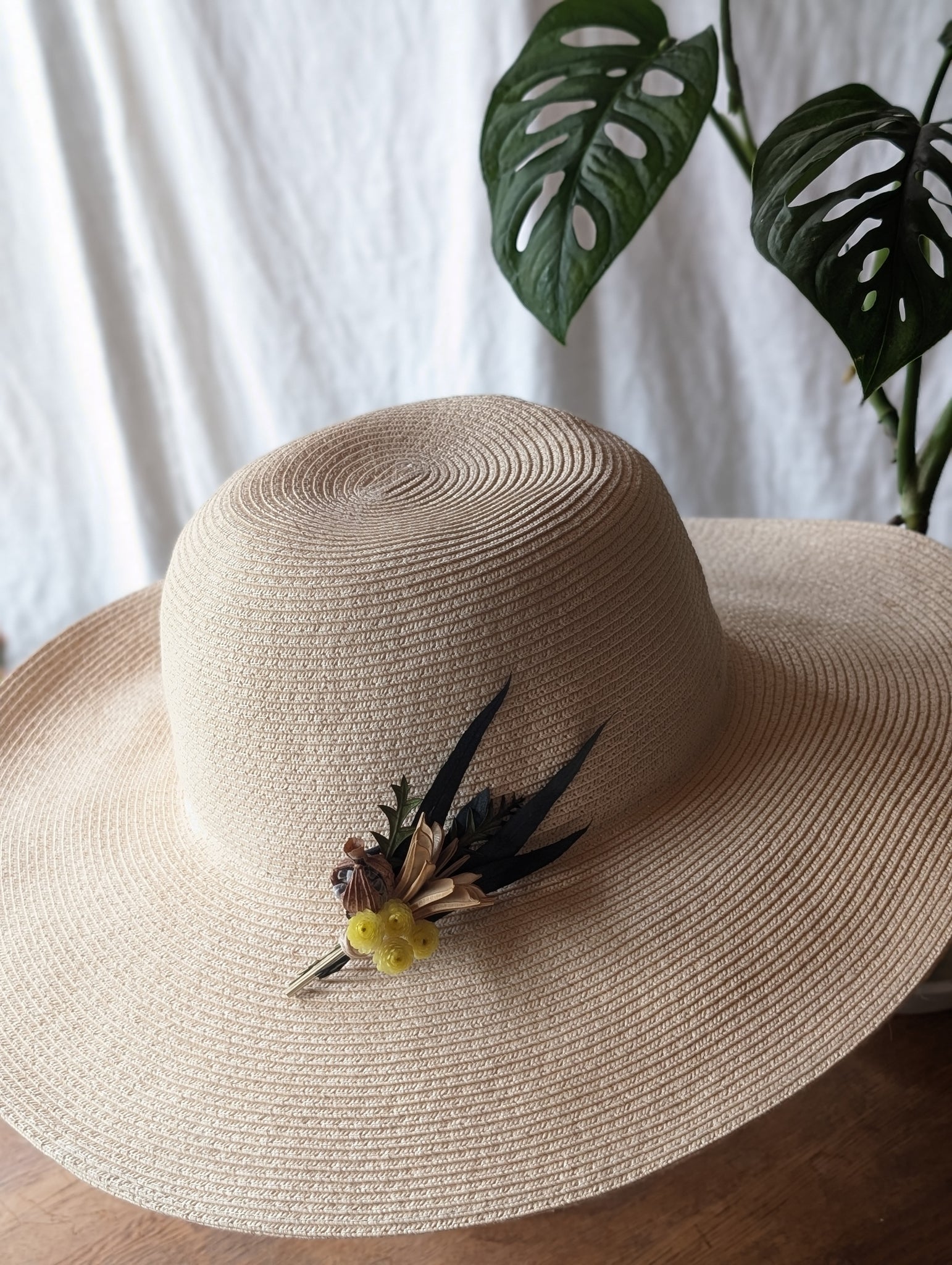 帽子やカゴバックにつけられるハットコサージュを作りました。もちろん胸元にも◎素材…プリザーブドフラワー、ドライフラワー長さ…約12センチ(葉の先まで)幅 …約4.5センチ※写真の帽子はつきません。 コサージュケースに入れて、お送りいたします。長く楽しんでいただくために、高温多湿はカビの原因になります。直射日光を避け、風通しの良い涼しい場所で保管してください。※配達の際、素材上 花材が多少落ちる場合があります。また、お使いのパソコンによって色合いの見え方に違いが生じます。ご了承ください。