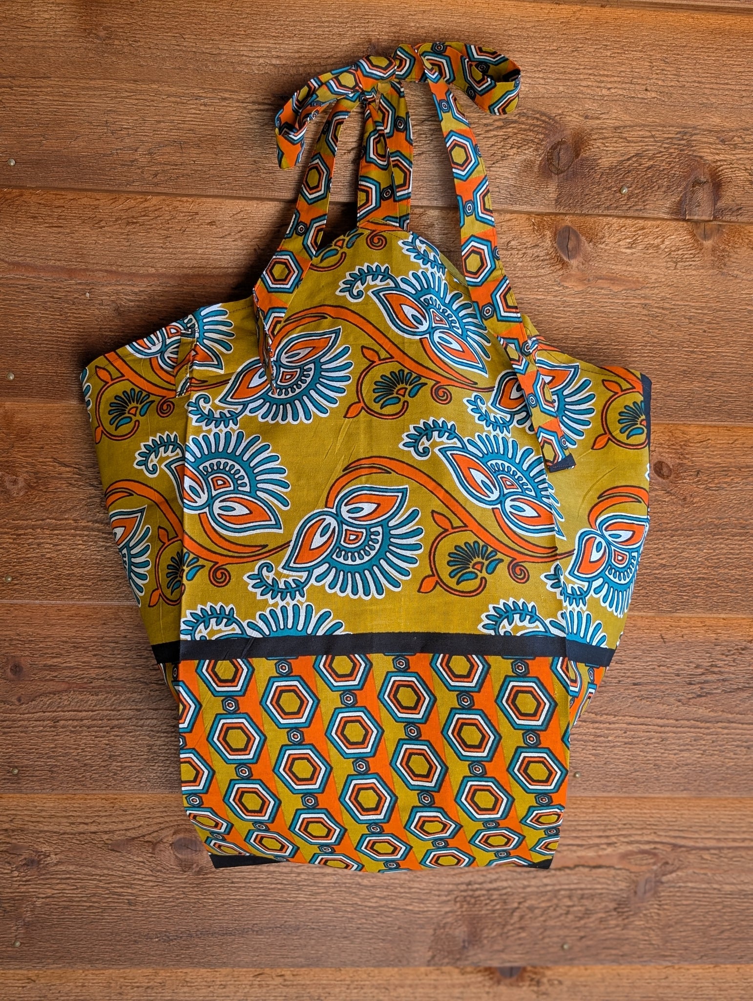 ウガンダからやって来たカラフルな布で、フラワーバッグを作りました。